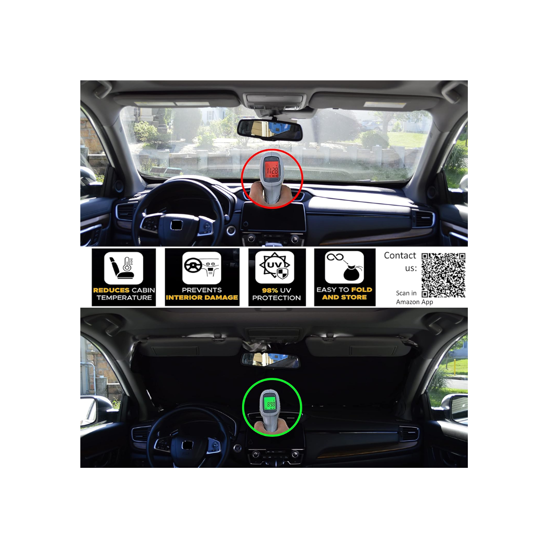 Premium Material: Made of high-quality silver-coated material, the windshield sunshade is durable, not easy to fade, tear-resistant and non-slip. The silver coating blocks up to 99% of harmful UV rays, providing you with a cooler and more comfortable car interior.